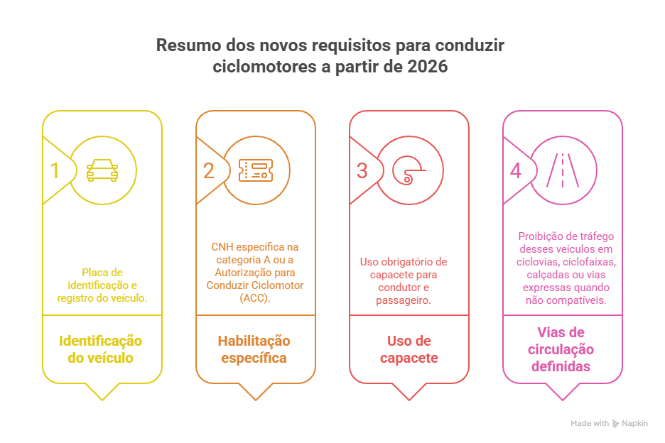 Ciclomotores estarão sujeitos às mesmas penalidades de outros veículos motorizados. Infrações como circular sem placa, sem capacete, em local proibido ou sem licenciamento poderão gerar multas de nível médio a gravíssimo — incluindo possibilidade de suspensão da CNH.